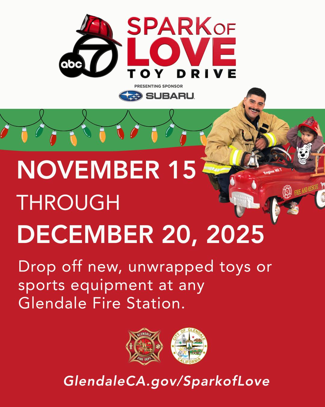 The Glendale Fire Department and ABC7 invites you to bring holiday cheer to the underserved families of our community by supporting the 33rd Annual Spark of Love Toy Drive. Join Glendale Firefighters in the campaign to collect new, unwrapped toys and sports equipment for our children in need. Your generosity to Spark of Love will make a difference in each child’s life as they celebrate and remember this wonderful holiday season. Visit GlendaleCA.gov/SparkofLove for more information!